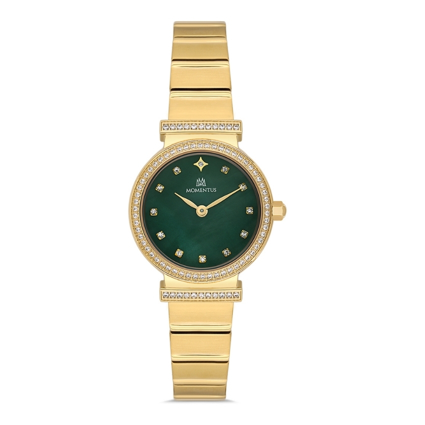 Momentus SS396G-15SG, Swarovski taşlarla bezeli zarif tasarımı ve altın tonlu paslanmaz çelik kasasıyla öne çıkan bir kadın kol saatidir. Quartz mekanizması, mineral camı ve 5 ATM su geçirmezlik özelliği sayesinde hem şıklığı hem de günlük kullanım güvenilirliğini bir arada sunar